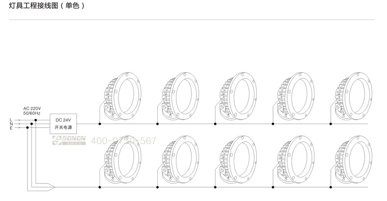l灯具DC24V最大并接50/30/20台,超过50/30/20台请加电源输入线。