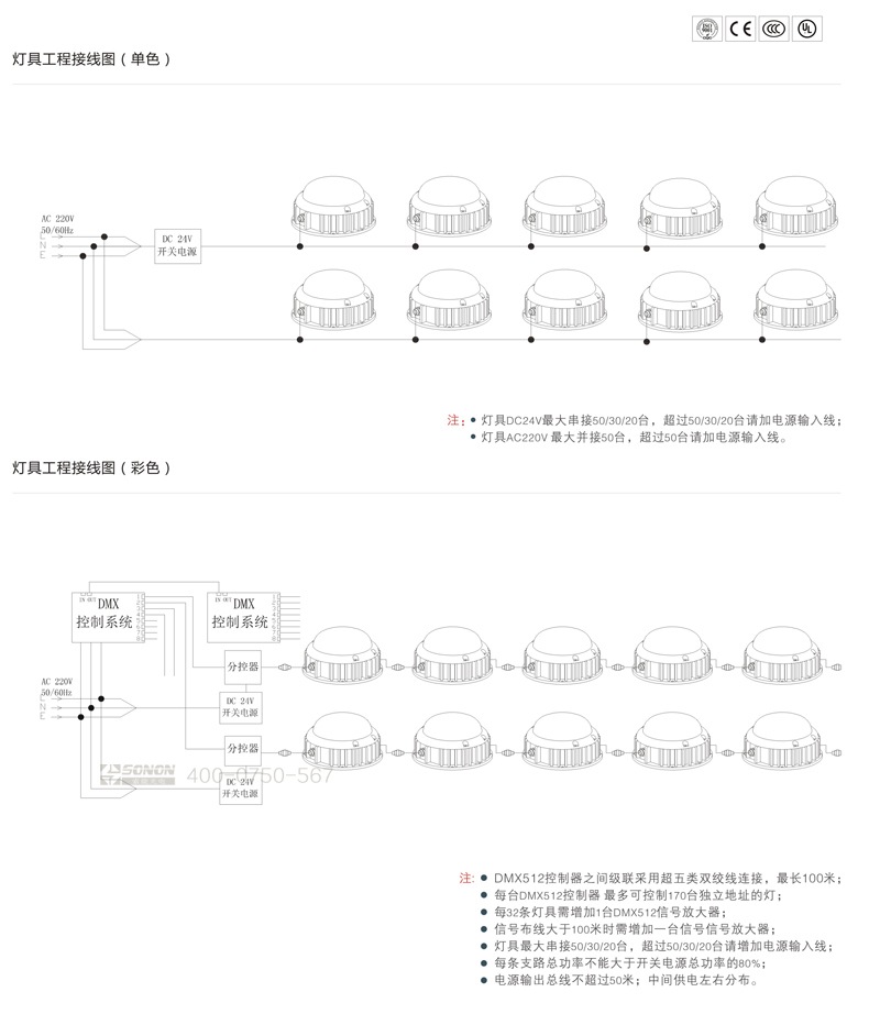 l灯具最大串接50/30/20台,超过50/30/20台请增加电源输入线。