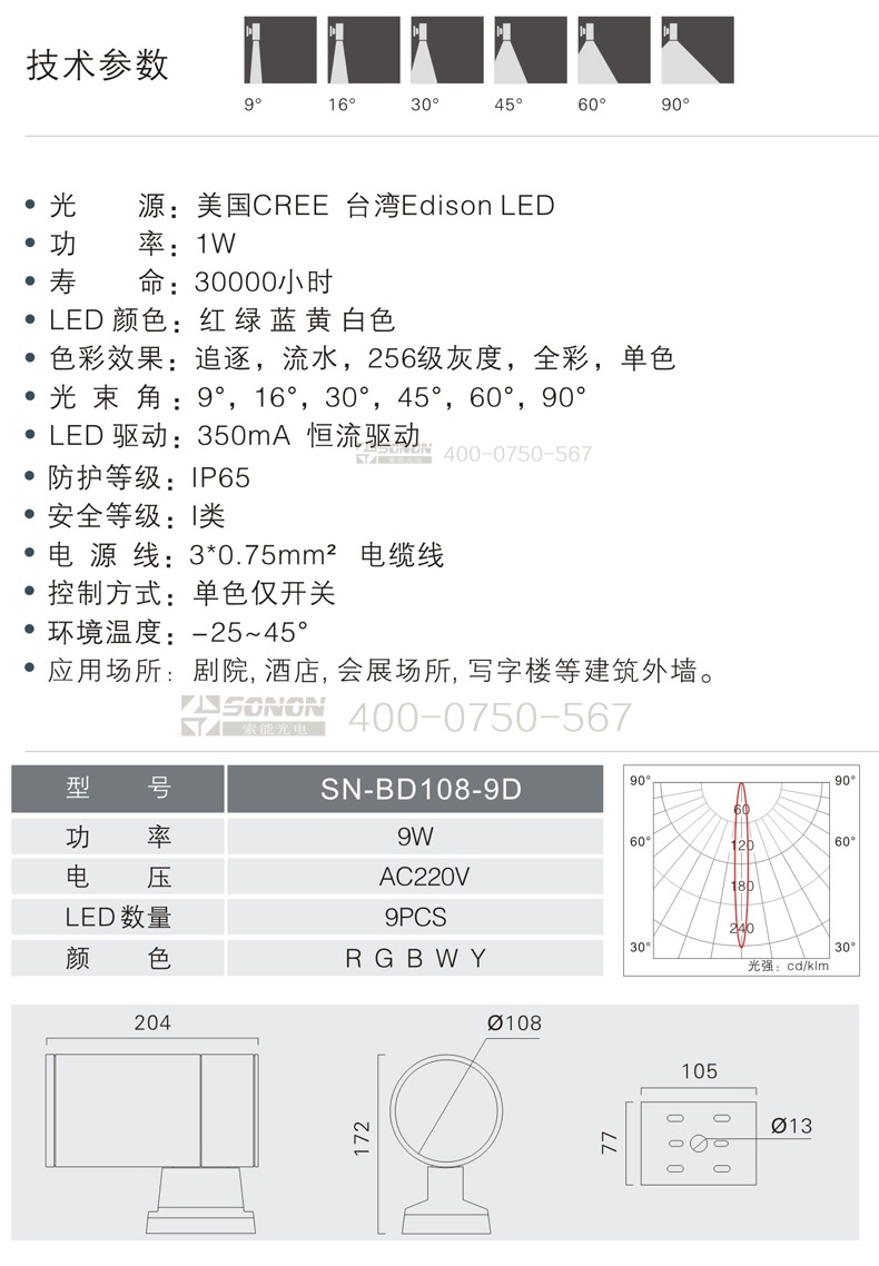 l光束角:9°,16°,30° 45°,60°,90°;