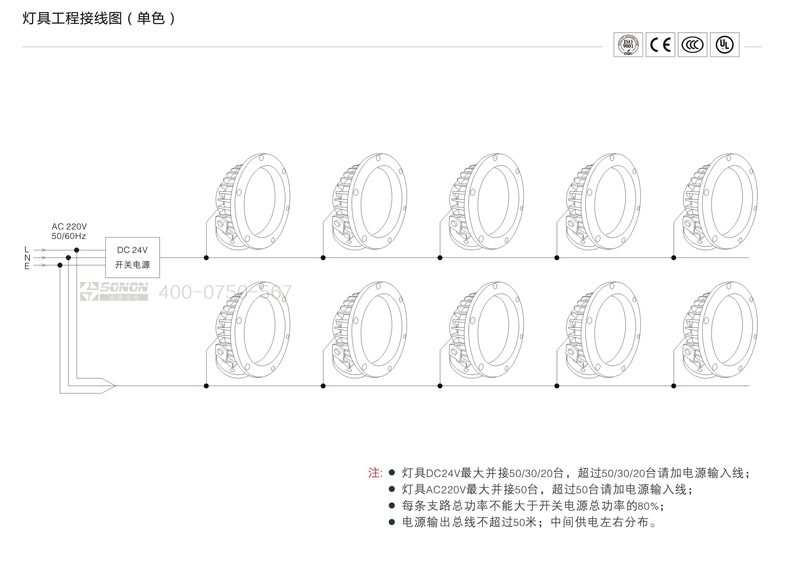 l灯具DC24V最大并接50/30/20台,超过50/30/20台请加电源输入线。