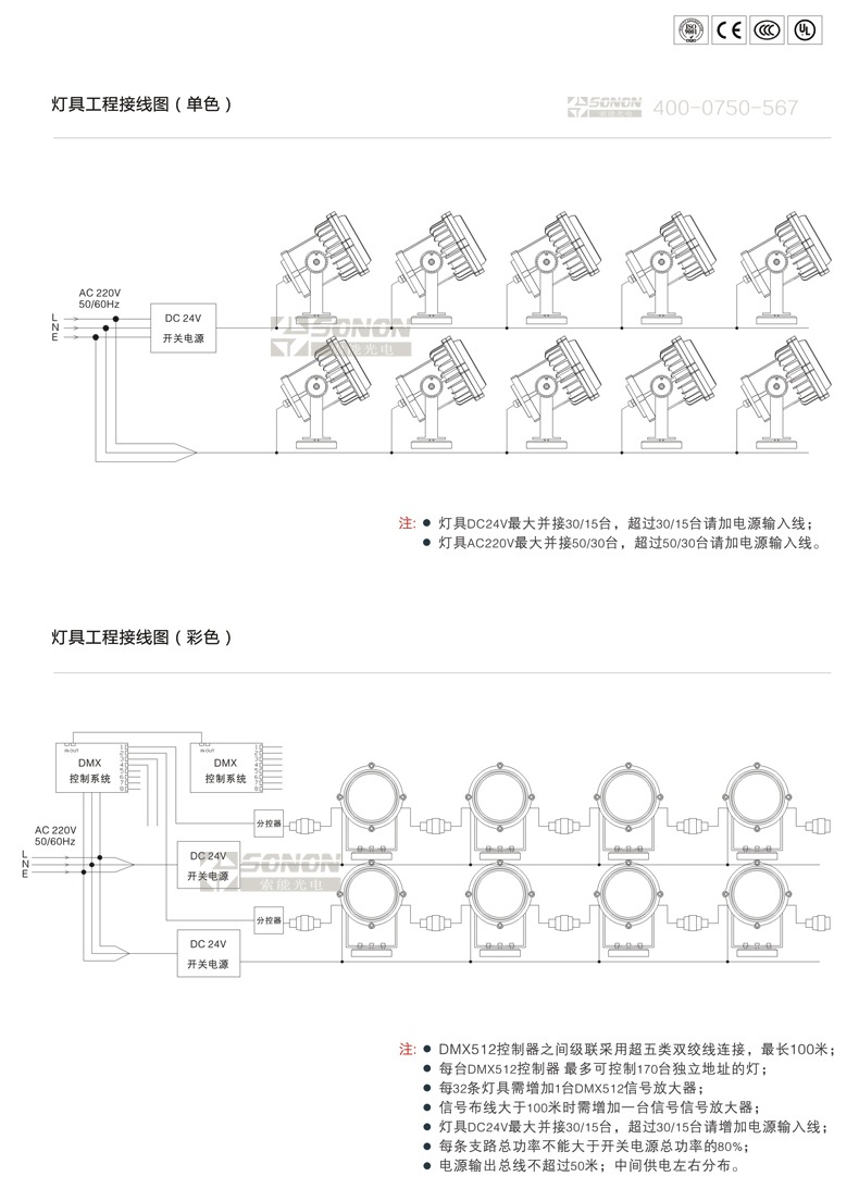 l灯具DC24V最大并接30/15台,超过30/15台请加电源输入线。
