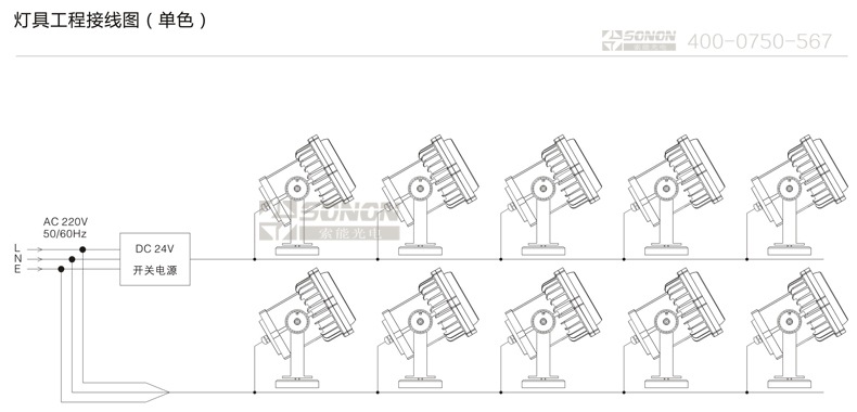 l灯具AC220V最大并接50/30台,超过50/30台请加电源输入线。