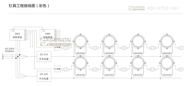 l灯具DC24V最大并接30/15台,超过30/15台请增加电源输入线。