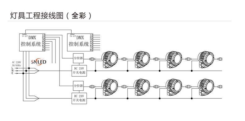 1、灯具DC24V并接不超过50/30/20/15台,超过50/30/20/15台请加电源输入线;