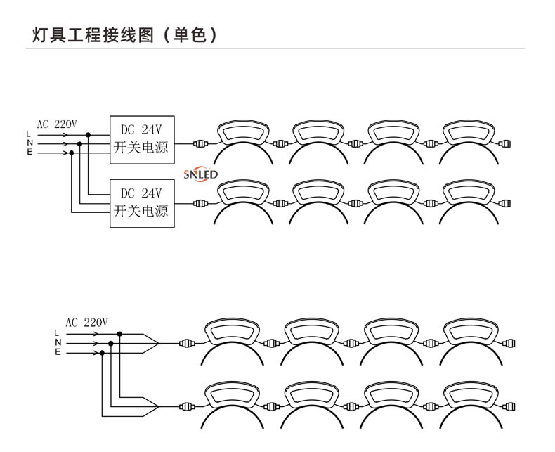 2、灯具AC220V 串接不超过20/10台,超过20/10台请增加电源输入线;