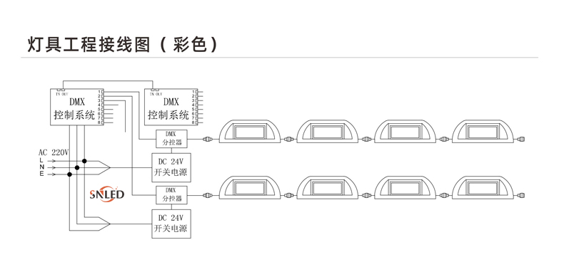 5、灯具DC24V并接不超过15台,超过15台请增加电源输入线;
