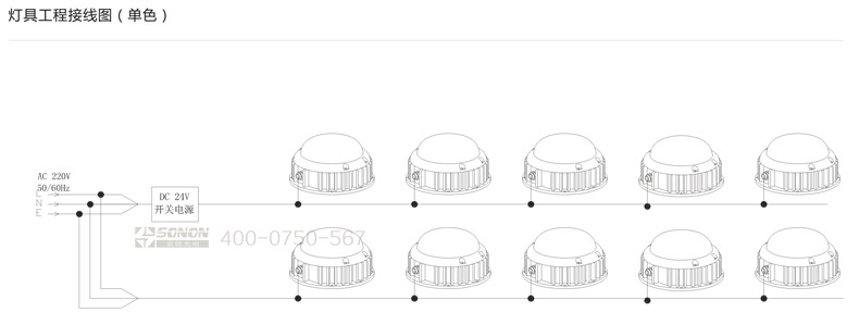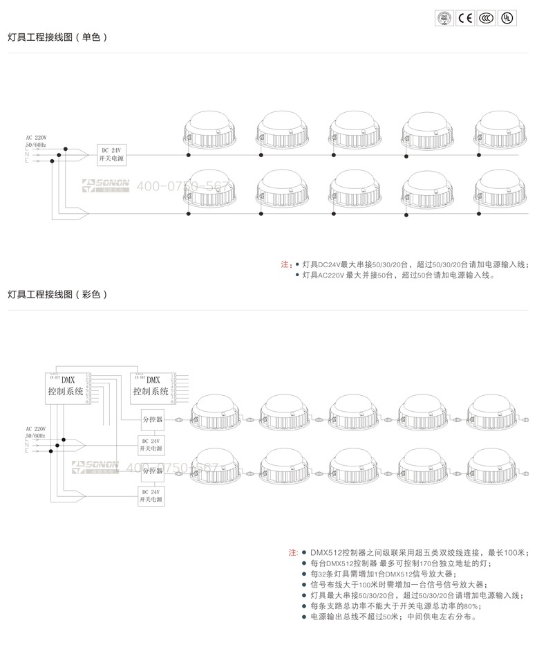 l灯具最大串接50/30/20台,超过50/30/20台请增加电源输入线。